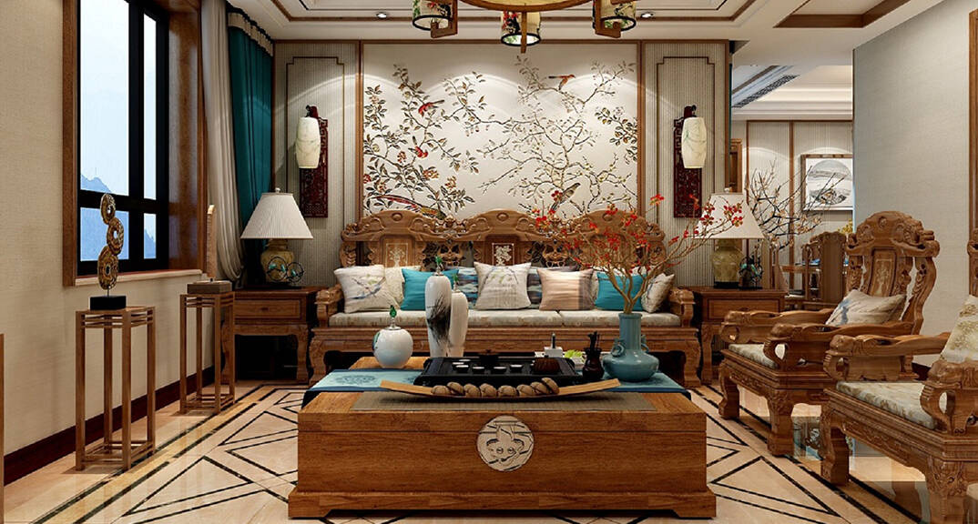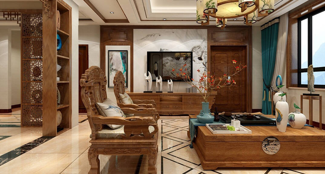 海川泓久山墅635㎡別墅客廳新中式風(fēng)格裝修案例效果圖