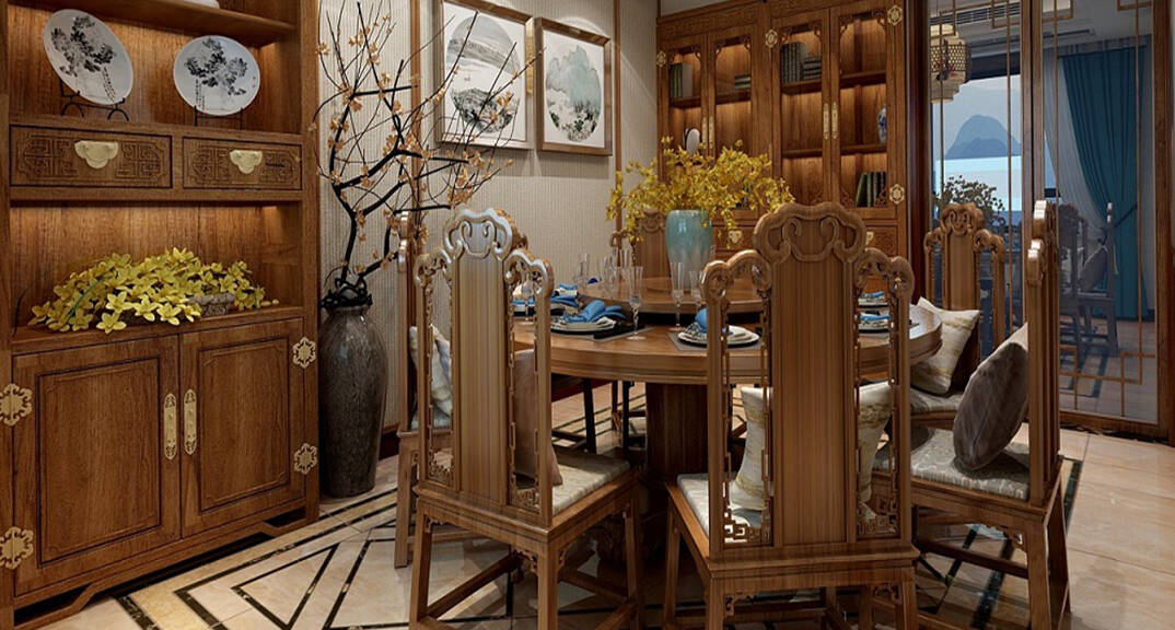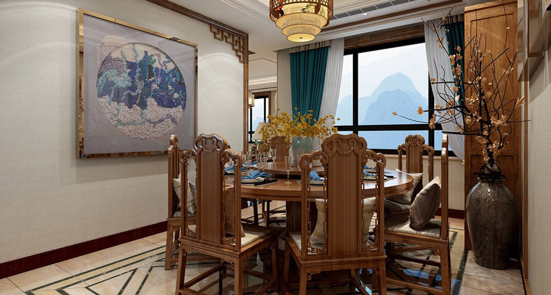 海川泓久山墅635㎡別墅餐廳新中式風(fēng)格裝修案例效果圖