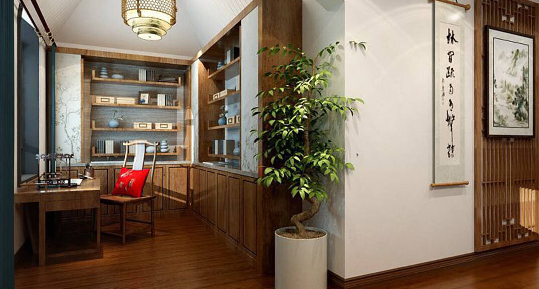 海川泓久山墅635㎡別墅書(shū)房新中式風(fēng)格裝修案例效果圖
