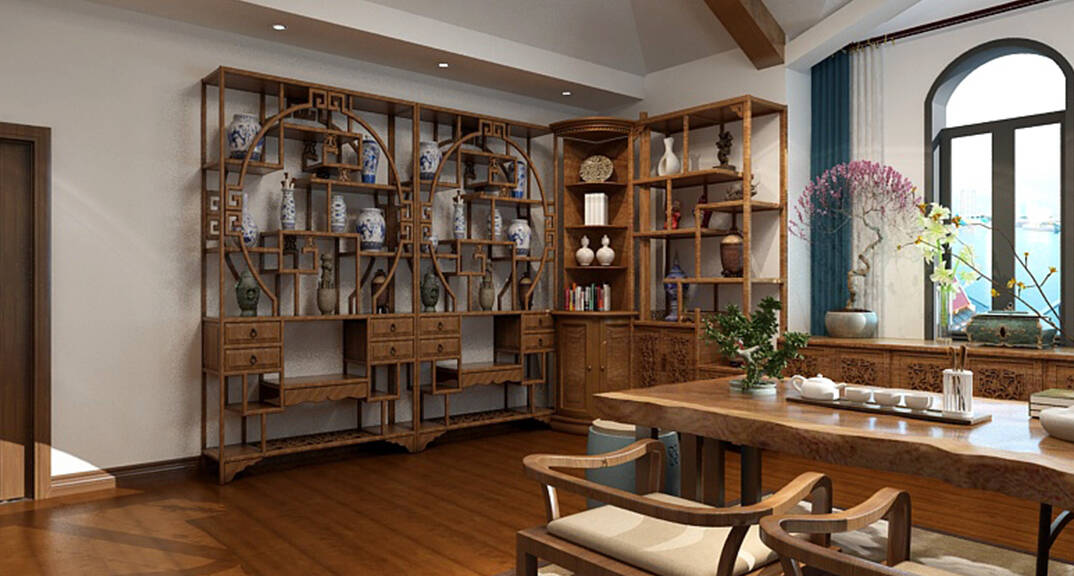 海川泓久山墅635㎡別墅收藏室新中式風(fēng)格裝修案例效果圖