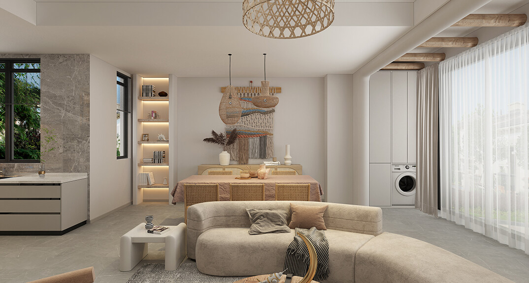 融創(chuàng)紅島壹號(hào)院207㎡別墅餐廳侘寂風(fēng)格裝修案例效果圖