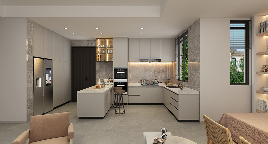 融創(chuàng)紅島壹號(hào)院207㎡別墅廚房侘寂風(fēng)格裝修案例效果圖