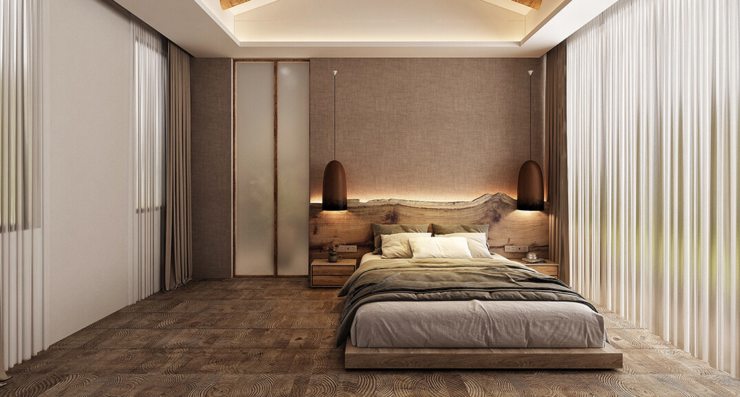 融創(chuàng)紅島壹號(hào)院207㎡別墅主臥侘寂風(fēng)格裝修案例效果圖