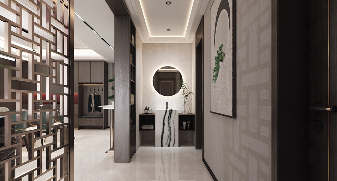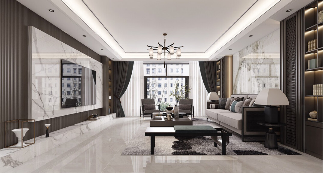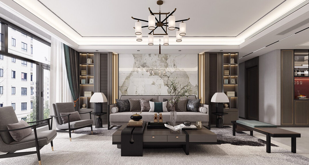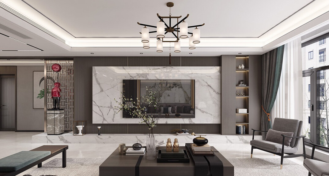 綠城·海棠印月166㎡三室二廳客廳新中式風格裝修案例效果圖