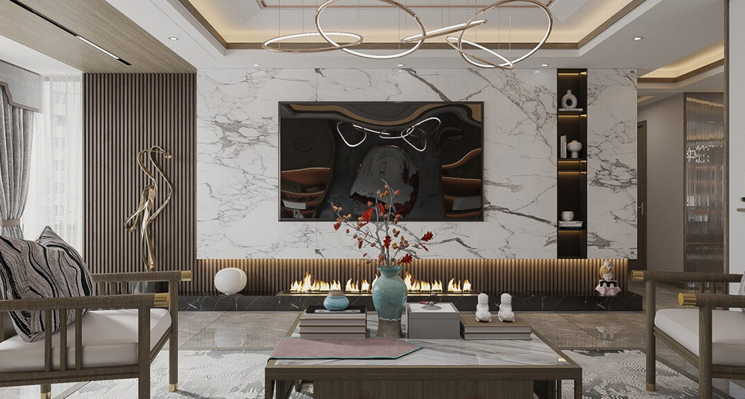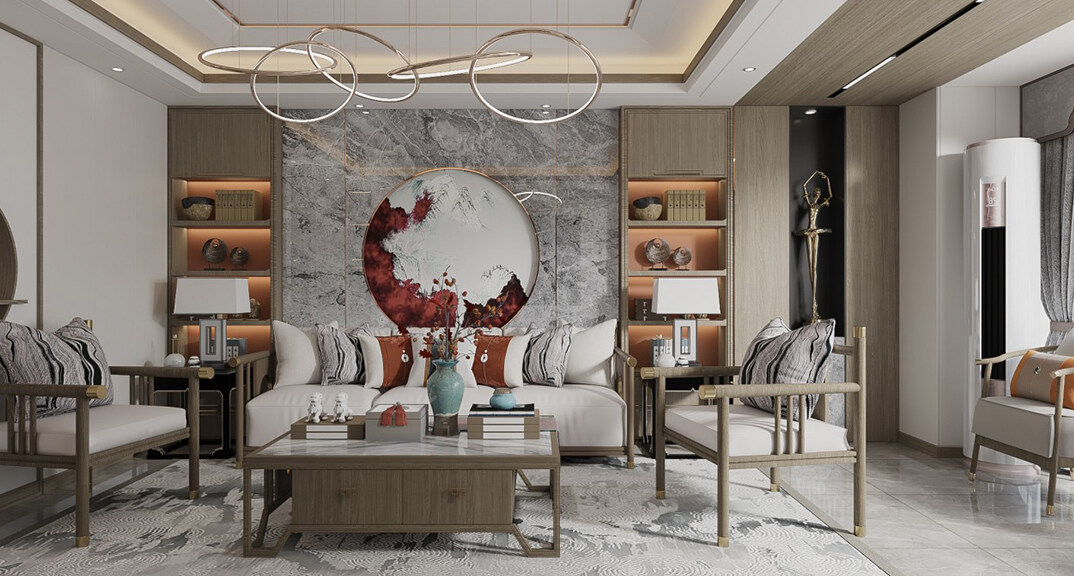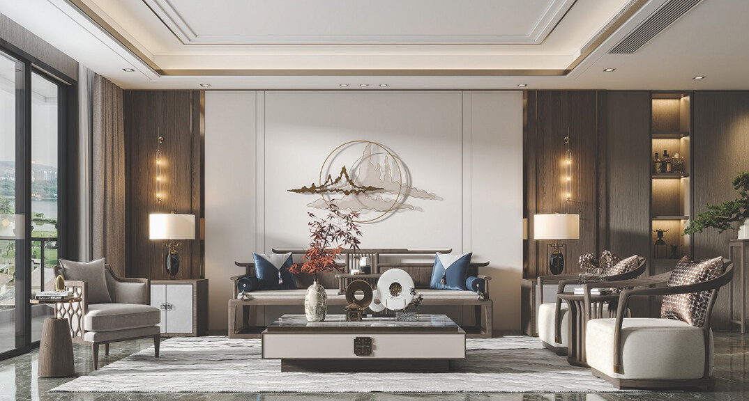 綠城曉峰湖畔130㎡三室二廳客廳新中式輕奢風(fēng)格裝修案例效果圖
