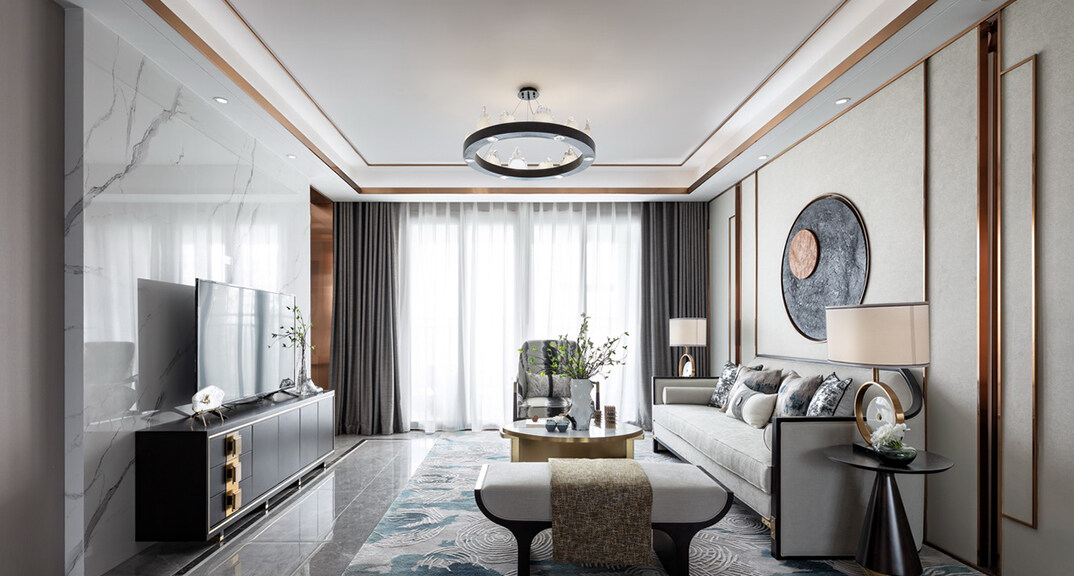 青特星城119㎡三室兩廳客廳新中式風(fēng)格裝修案例效果圖