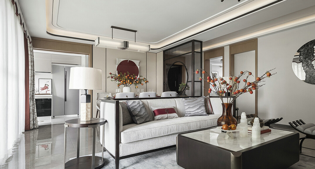 青特星城142㎡三室兩廳客廳沙發(fā)新中式風格裝修案例效果圖