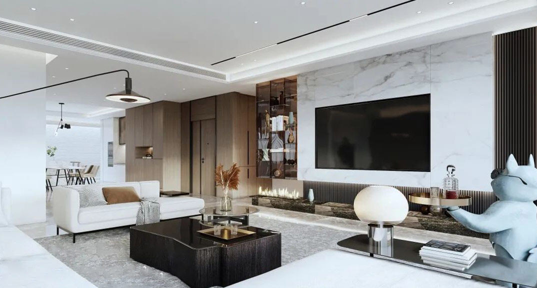 日鋼綠城300㎡別墅客廳現(xiàn)代輕奢風格裝修案例效果圖