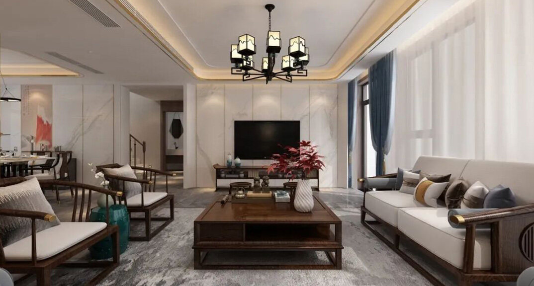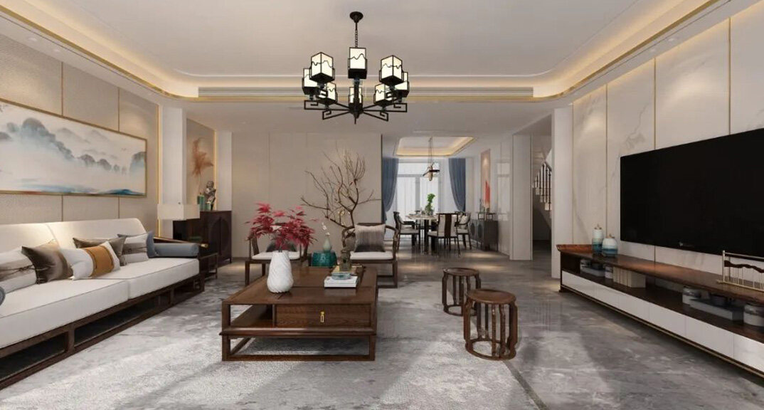 山水龍庭300㎡別墅客廳電視新中式風格裝修案例效果圖