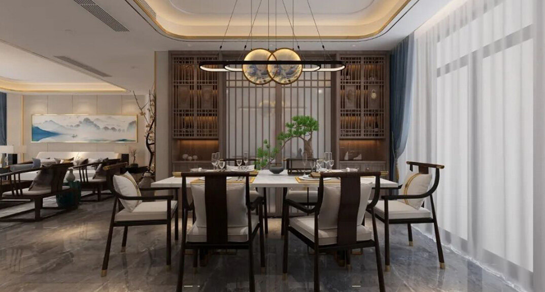 山水龍庭300㎡別墅餐廳新中式風格裝修案例效果圖