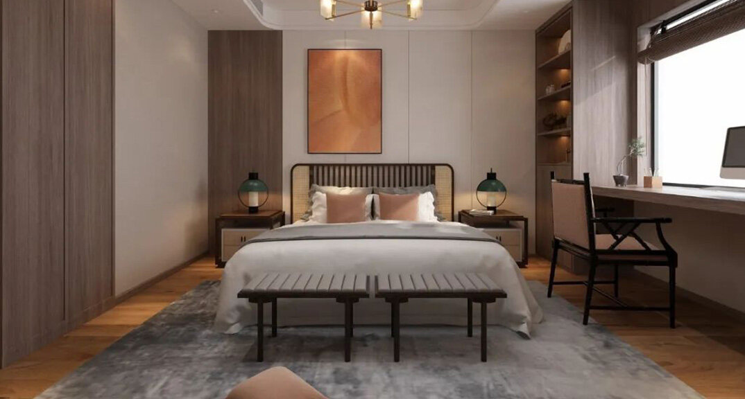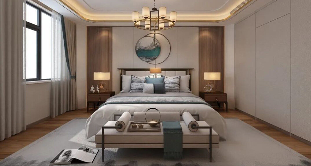 山水龍庭300㎡別墅主臥新中式風格裝修案例效果圖