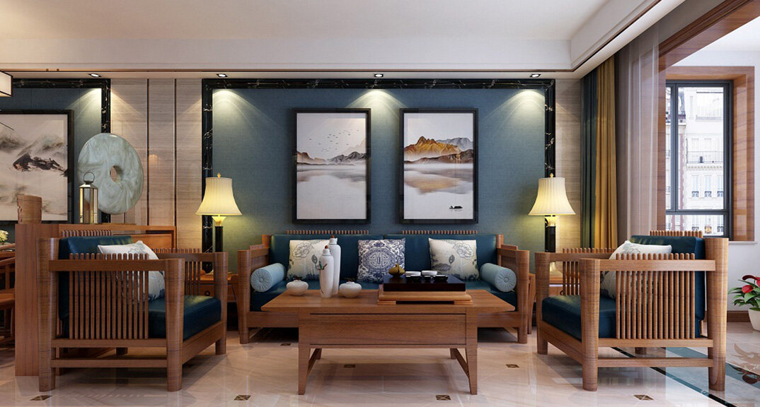 魯潤靜園156㎡三室兩廳客廳沙發(fā)簡(jiǎn)約中式風(fēng)格裝修案例效果圖