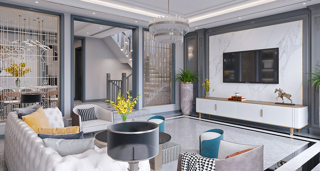 泰和郡338㎡聯(lián)排別墅客廳電視美式輕奢風格裝修案例效果圖