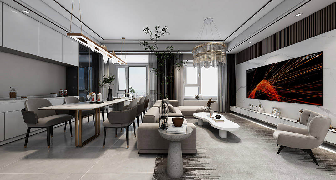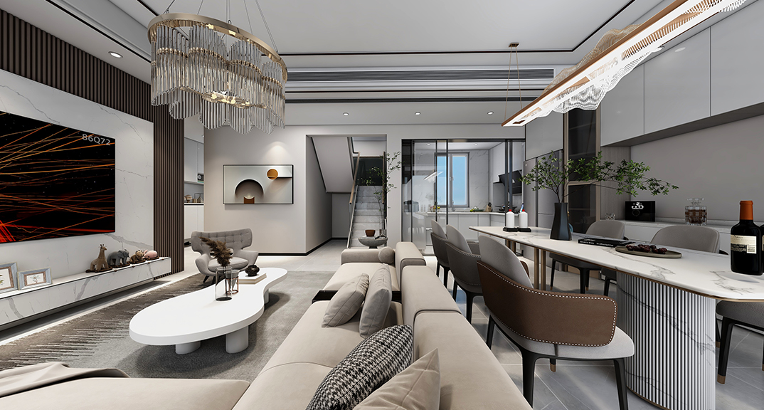 昆侖府150㎡疊拼上疊客廳現(xiàn)代輕奢風(fēng)格裝修案例效果圖