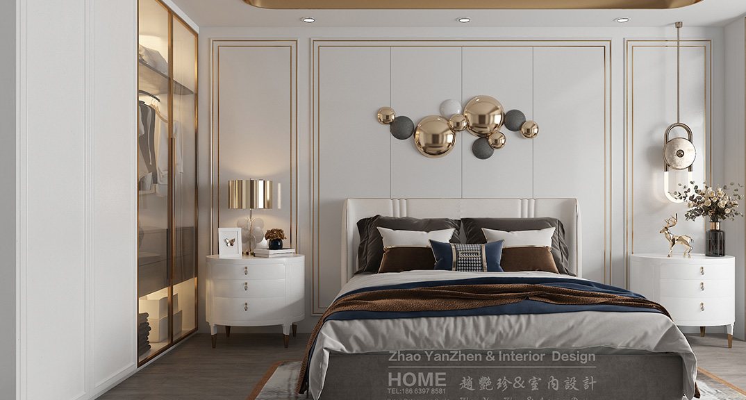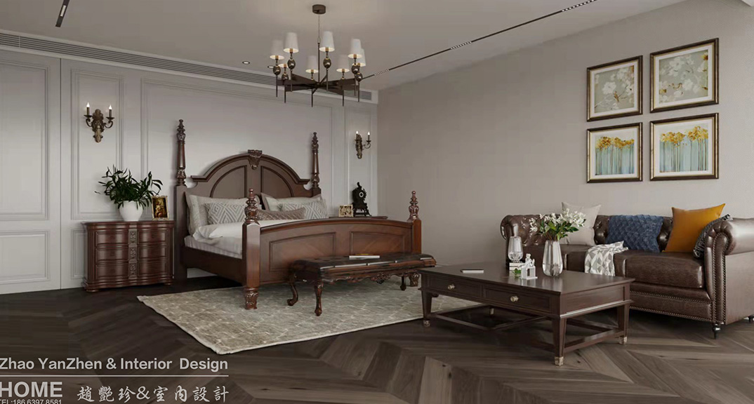 璞麗豪庭287㎡疊拼上疊一樓主臥美式輕奢風格裝修案例效果圖