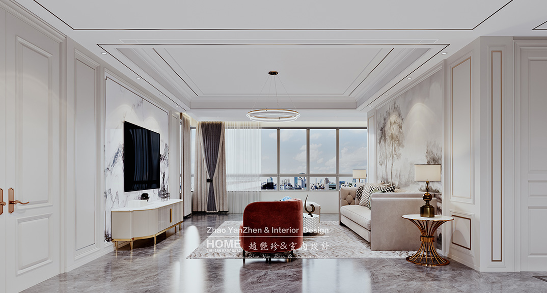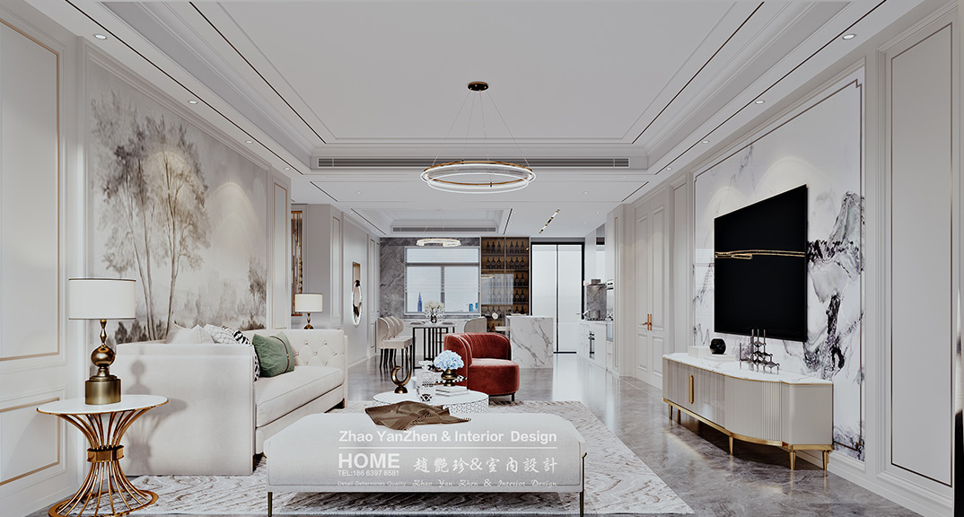 璞麗豪庭287㎡疊拼上疊客廳美式輕奢風格裝修案例效果圖