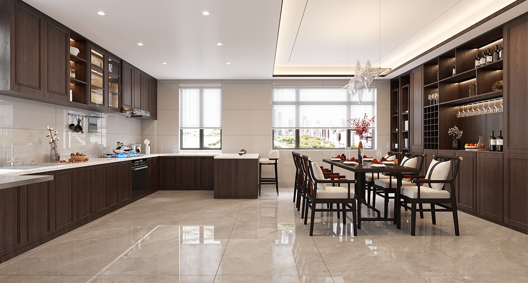 河山別墅300㎡別墅餐廳廚房新中式風格裝修案例效果圖