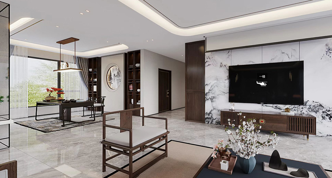 河山別墅300㎡別墅一樓茶室新中式風格裝修案例效果圖