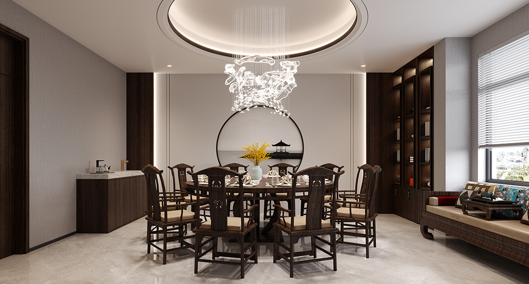 河山別墅300㎡別墅客餐廳新中式風格裝修案例效果圖