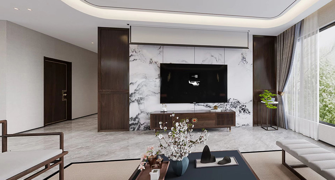河山別墅300㎡別墅客廳電視新中式風格裝修案例效果圖
