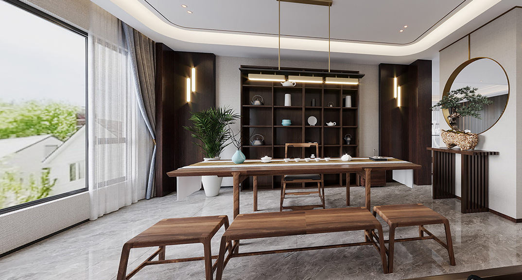 河山別墅300㎡別墅茶室新中式風格裝修案例效果圖