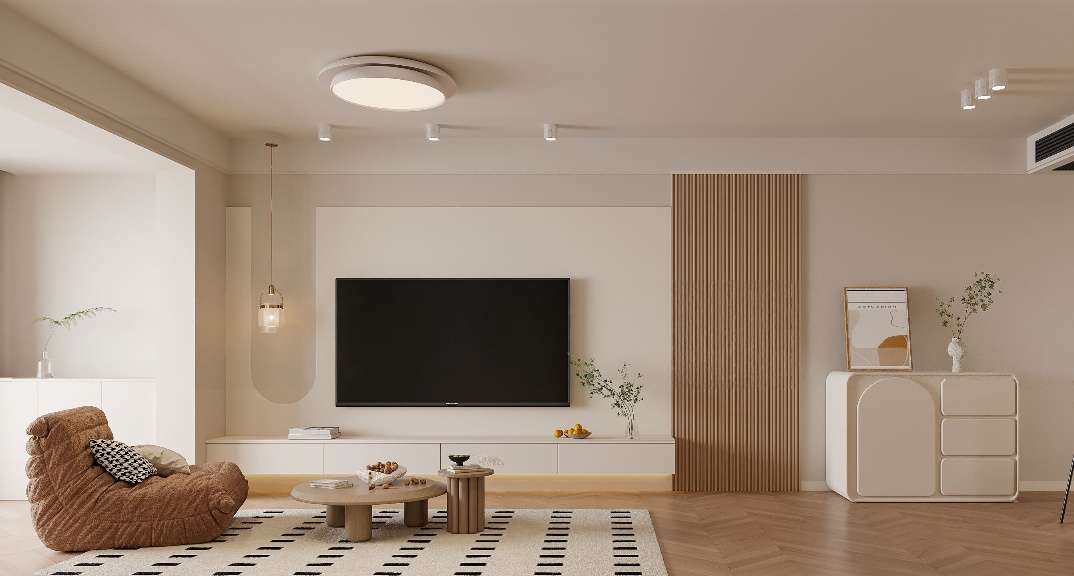 主要圍繞著開放、明亮、互動的設(shè)計理念進(jìn)行規(guī)劃。布局采用開放式設(shè)計,連接餐廳和廚房,形成一個流暢的活動空間,增加家人之間的互動性和空間的趣味性。效果上也讓整體空間顯得寬敞明亮。配色上主要以白色和原木色為主,家具選擇簡潔大方的布藝家具,取消傳統(tǒng)的茶幾功能,采用可移動的零食柜讓客廳有更多的可能性,突顯空間的寬敞感。燈光,采用多層次的照明設(shè)計,包括主燈、射燈、壁燈和燈帶,營造出溫馨的氛圍。