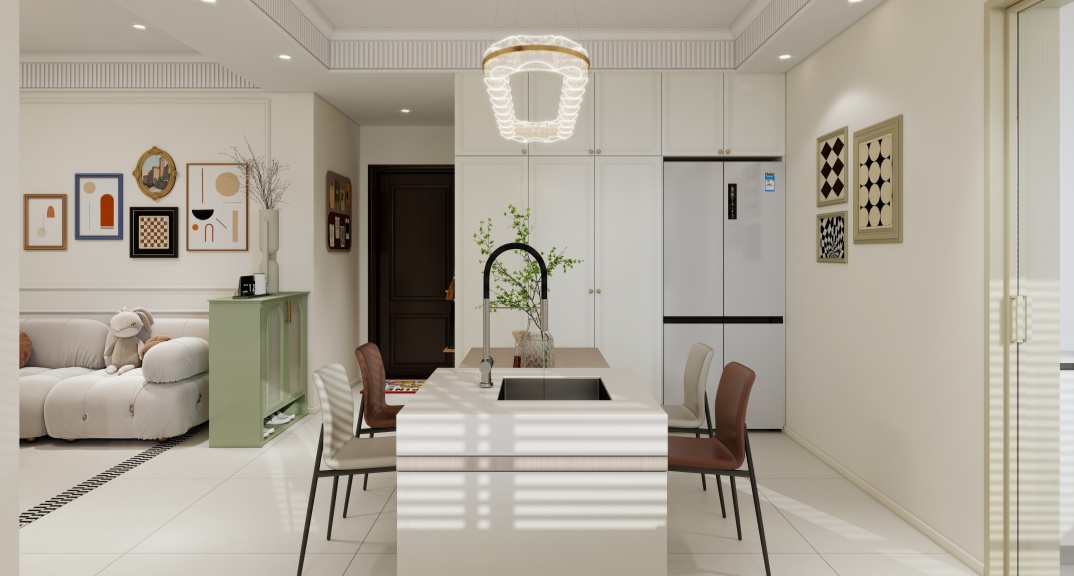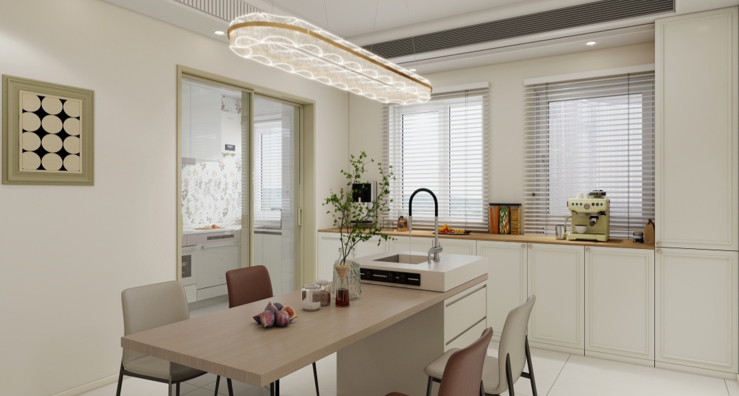 2.原來客廳區(qū)域較別扭,沒有完整電視墻及沙發(fā)墻,且客戶喜歡制作餐點(diǎn),喜歡島臺設(shè)計(jì),想要大量收納及一個(gè)西廚區(qū),現(xiàn)將原來客廳區(qū)域規(guī)劃為西廚區(qū),做了餐島一體,增加了收納功能,客廳放到原來餐廳區(qū)(及擴(kuò)出來的區(qū)域)