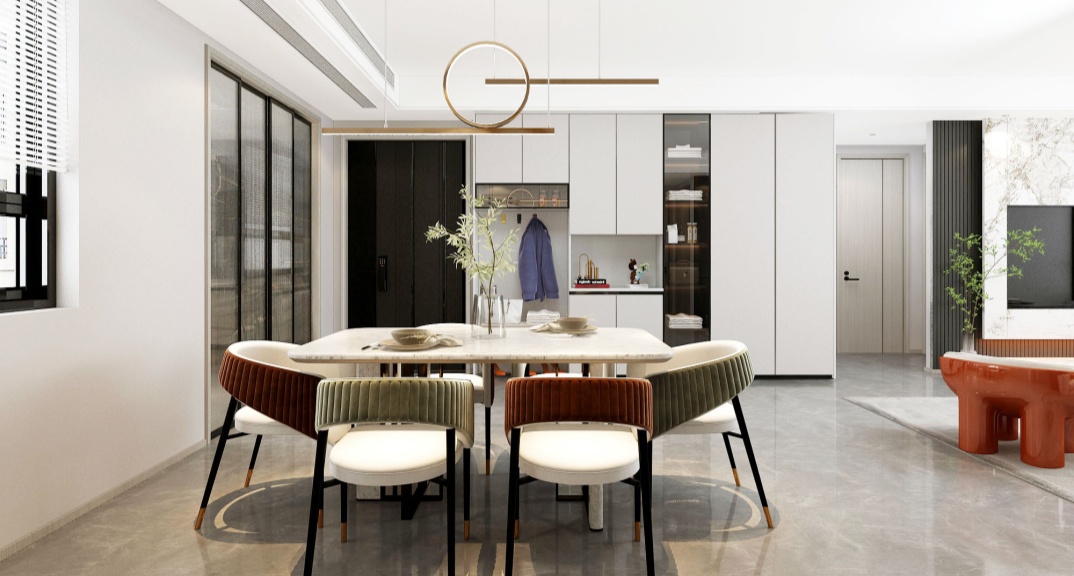 沒做無主燈,全屋簡單的雙眼皮吊頂墻面刷乳膠漆;餐廳選擇了雙頭吊燈餐廳不大,風(fēng)鈴的造型,讓整個公區(qū)充滿了氛圍感!餐邊柜柜門和背景墻木飾面選擇了同色:子午灰,真皮沙發(fā)和餐廳吊燈黑色相呼應(yīng)潘多拉的巖板與餐桌桌面花紋同款。