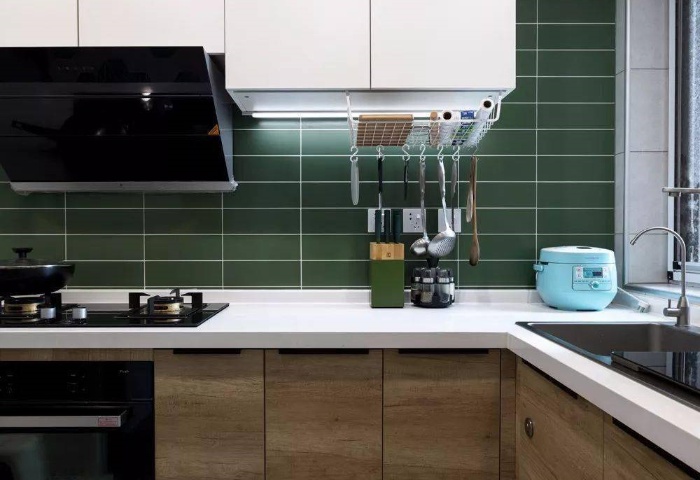 可將洗菜區(qū)域的臺面設(shè)計(jì)的略高于炒菜臺面10cm,方便日后使用。