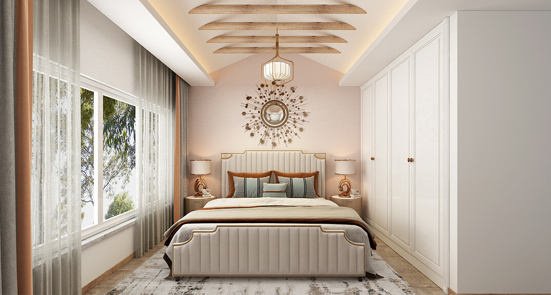 融創(chuàng)紅島壹號(hào)院207㎡別墅主臥侘寂風(fēng)格裝修案例效果圖