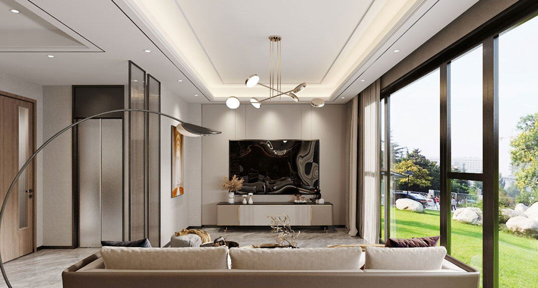 青島小鎮(zhèn)175㎡別墅下疊客廳電視輕奢極簡(jiǎn)風(fēng)格裝修案例效果圖