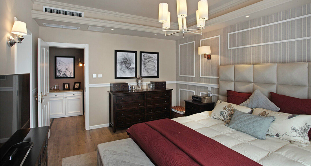檀府300㎡別墅主臥現(xiàn)代美式風格裝修案例效果圖
