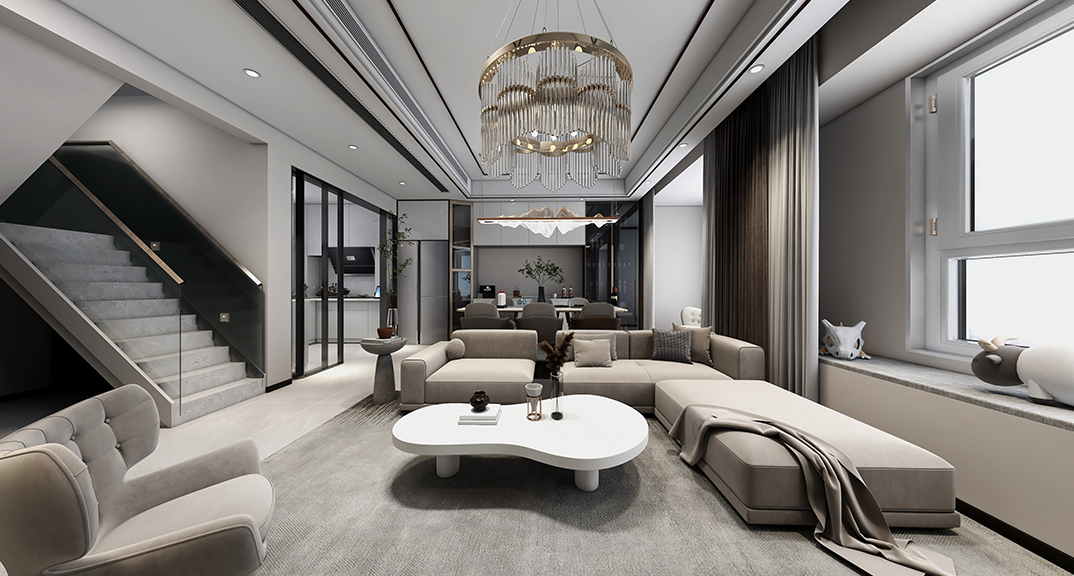 昆侖府150㎡疊拼上疊客廳現(xiàn)代輕奢風格裝修案例效果圖